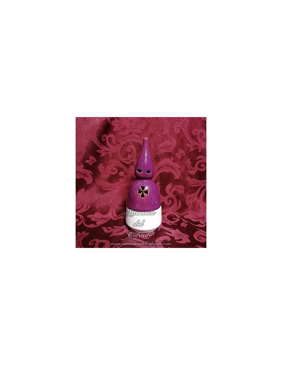 Incensario de barro con forma de nazareno esmaltado con color blanco y morado, ideal para los cofrades y amante a la Semana Santa.