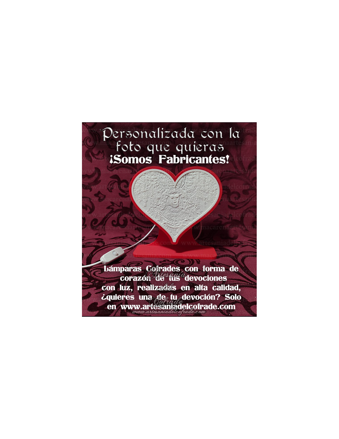 Esta lámpara está fabricada en impresión 3D de alta calidad, con un tamaño aproximado de 15 cm. Puedes personalizarla con la fotografía o devoción que más te guste.