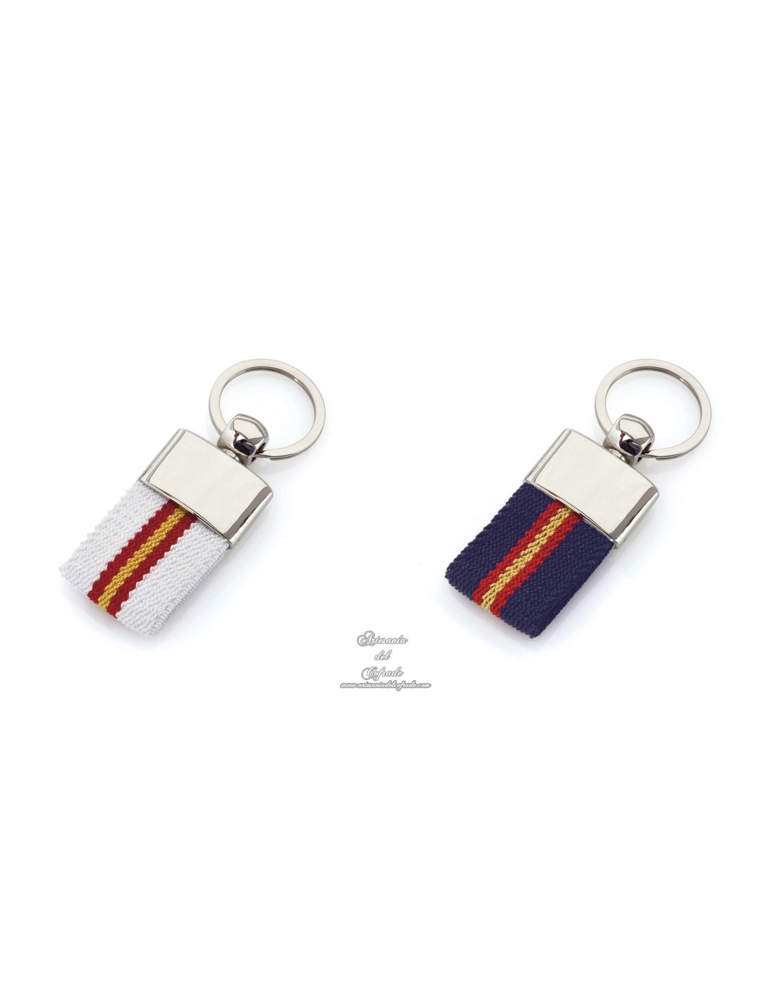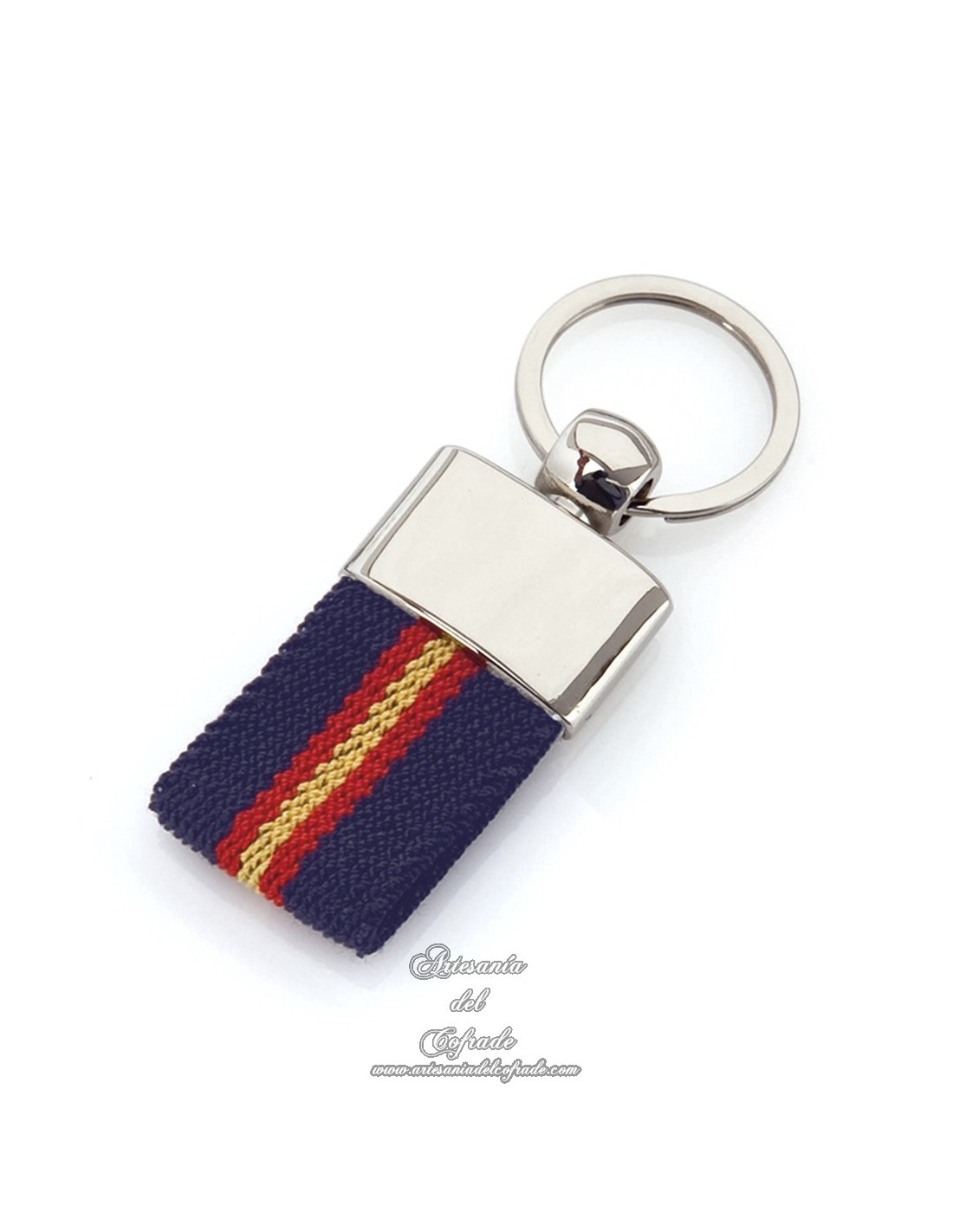 Llavero de poliéster con accesorios de bandera española en la cinta y refuerzo metálico en acabado plateado brillante.