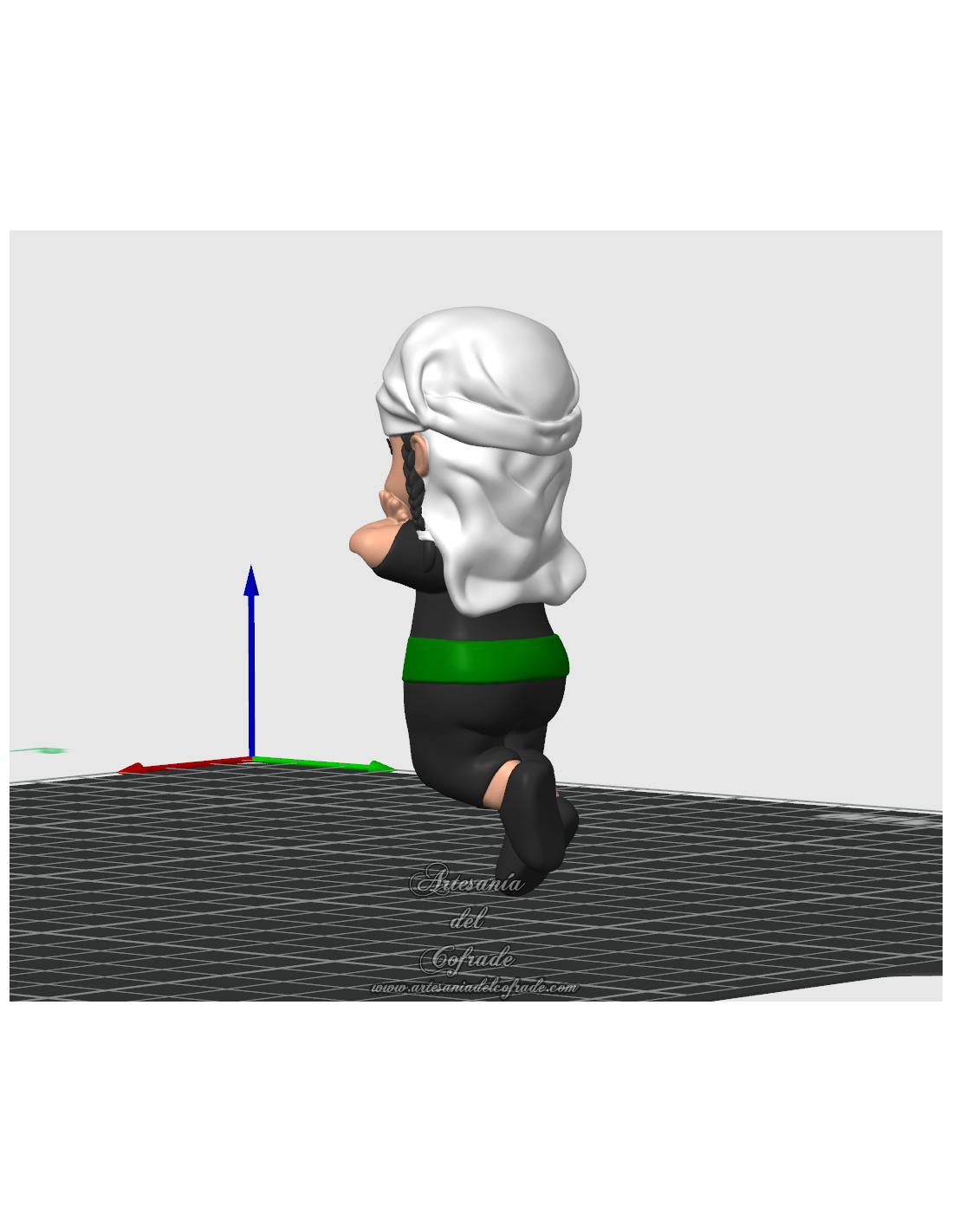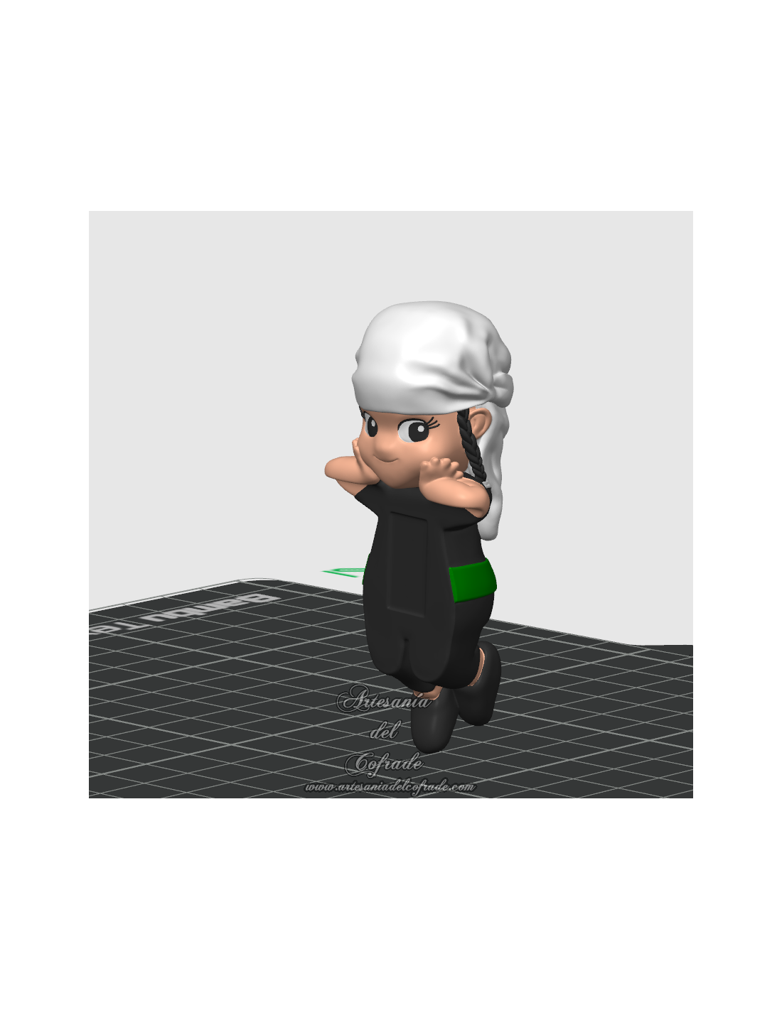 Vestida con un pantalón y camiseta de color negro, faja verde y un simbólico costal blanco, esta pequeña figura está modelada con la máxima precisión, cuidando cada trazo y pliegue para que refleje la autenticidad del atuendo costalero. Su característica trenza morena aporta personalidad y estilo a una pieza única que destaca entre otras figuras similares del mercado.