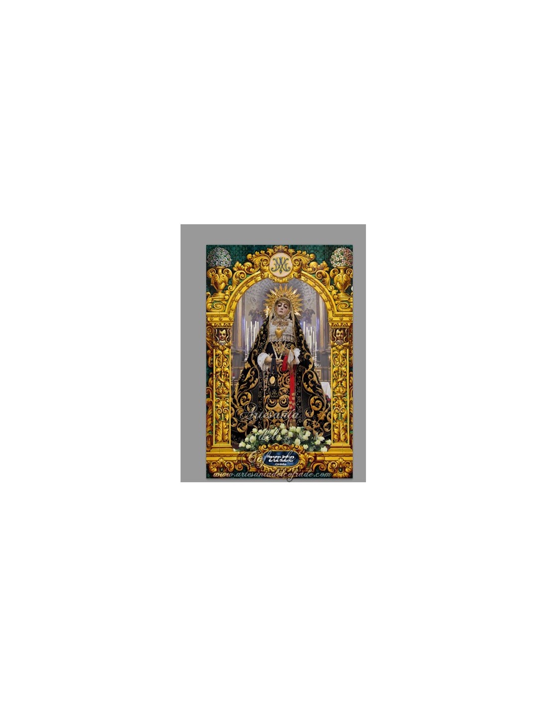 Trabajamos sublimación de alta definición sobre cerámica para conservar todos los matices: la mirada dolorida y serena, las lágrimas, el corazón traspasado y los ricos bordados del ajuar. El resultado es una imagen muy nítida, con colores estables en el tiempo y un acabado elegante, perfecta para salones, despachos, oratorios domésticos o rincones cofrades.