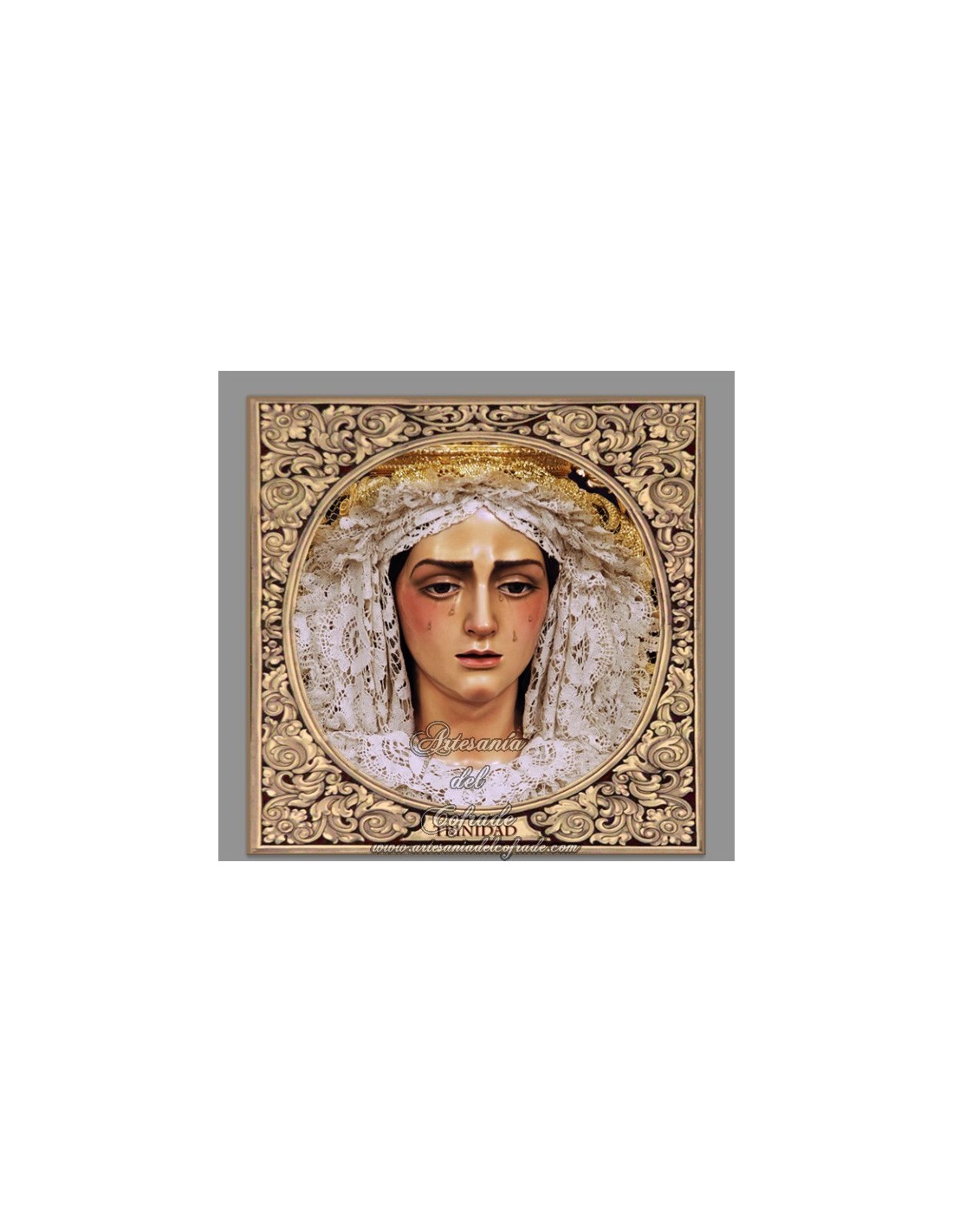 Trabajamos con sublimación de alta definición para respetar al máximo los matices de la Virgen de la Trinidad: la sutileza de las carnaciones, las lágrimas, el ceño fruncido y el juego de luces sobre el tocado y el manto. El resultado es una reproducción nítida, con colores estables y un acabado brillante perfecto para decorar salones, despachos o rincones cofrades de interior.
