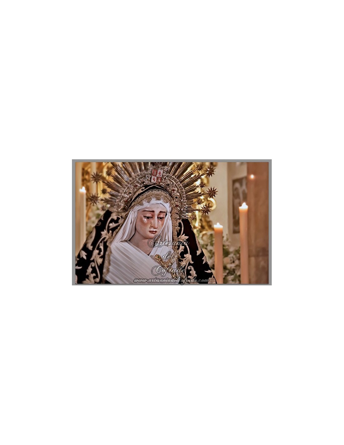 Nuestra técnica de sublimación de alta calidad se ha enfocado en ser fiel a la atmósfera de la escena. La impresión sobre cerámica permite apreciar la calidad de la talla, la oscuridad del luto y la expresión de una pena serena. El resultado es una reproducción nítida y con la solemnidad que exige una de las imágenes más históricas de Sevilla.